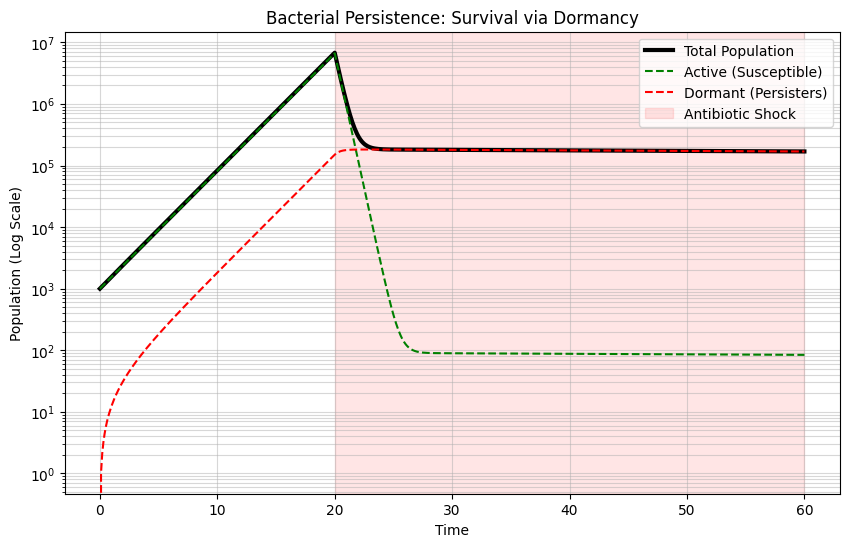 The powerful thing about these dormant bacteria is the resistance to antibiotics or any external threat to survival. The colony keeps a small part within the area with the sole purpose of the chance to survive after the storm settles. Here’s a simple graph I made from the paper by Balaban 2004 .